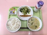 牛乳、麦ご飯、豚キムちゃんこ、きな粉豆、小松菜の胡麻和え