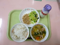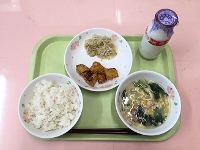 牛乳、麦ご飯、白菜の味噌汁、こいわしフライ、ほうれん草のアーモンド和え、納豆