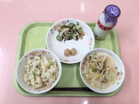 牛乳、チャーハン、ラーメン風スープ、煮卵、ひじきサラダ