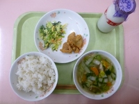 牛乳、麦ご飯、白菜とベーコンのスープ、鶏のから揚げ、ほうれん草と卵のサラダ