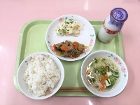 牛乳、麦ご飯、魚そうめんのすまし汁、玉ねぎと豚肉の炒め物、ポテトサラダ