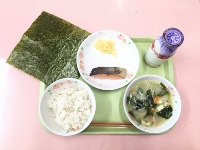 今日から来週の月曜日までの給食は「全国学校給食週間」に合わせた特別献立を実施します。特別献立1日目は、明治22年ごろの給食を再現した献立です。明治22年、山形県の小学校で家が貧しくてお弁当を持ってくることの出来ない子どもたちへ昼食を出したのが、学校給食の始まりとされています。当時の献立は、「おにぎり、焼き魚、漬け物」でしたが、それだけではみなさんに必要な栄養が足りないので、大根のみそ汁をつけています。今からおよそ130年前の給食です。味わって食べてほしいと思います。