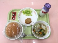 牛乳、コッペパン、野菜スープ煮、くじらメンチカツ、茹でキャベツ、ソース