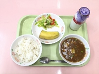 牛乳、チキンカレー、キャベツサラダ、バナナ
