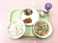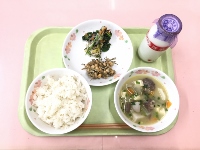 牛乳、麦ご飯、だご汁、ざぜん豆、小松菜のピーナッツ和え