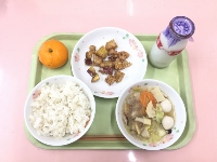 牛乳、麦ご飯、タイピーエン、レンコンとサツマイモのあげがらめ、みかん