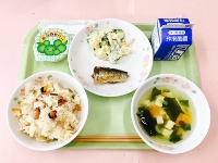 たこめし、牛乳、豆腐のすまし汁、いわしの生姜煮、ポテトサラダ、青梅ゼリー