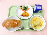 玄米パン、牛乳、コーンポタージュ、タンドリーチキン、トマトのさっぱりサラダ