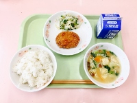 麦ごはん、牛乳、なめこ汁、うまかコロッケ、かみかみするめ和え