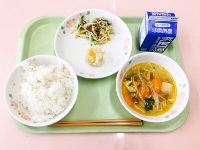 今日の給食には、「キムたくごはん」があります。長野県の給食の人気メニューで、キムチとたくあんが入った混ぜごはんです。他にも、豚肉やパプリカ、にらなど具だくさんです。また、「きびなごのカレーフライ」は天草でとれたきびなごです。今日の給食もよく噛んで残さず食べましょう。