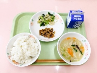 麦ごはん、牛乳、おひめさん団子汁、あさりのしぐれ煮、キャベツのおかか和え
