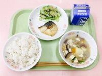 麦ごはん、牛乳、けんちん汁、さばの塩焼き、キャベツの昆布あえ