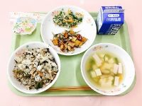 シーチキン入りひじきごはん、牛乳、すまし汁、ミックスかりんとう、おくらのおかか和え、七夕ゼリー