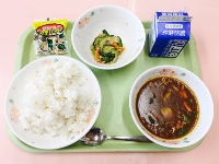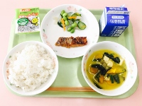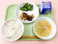 麦ごはん、牛乳、オニオンスープ、高野豆腐とレバーのピーナツ和え、きゅうりの即席漬け