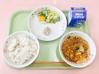 今日は中華の献立です。麻婆春雨や麻婆豆腐など、「麻婆」がつく料理には、ある調味料が使われています。それは、辛みの「豆板醤」です。豆板醤は、そら豆で作ったみそに赤とうがらしを加えたものです。一口30回を目標に、今日の給食もよく噛んで残さず食べましょう。