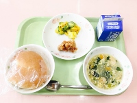 米粉パン、牛乳、えびと冬瓜のスープ、鶏のからあげ、かぼちゃサラダ