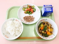 今日は「ふるさとくまさんデー」です。今月の注目食材は「ピーマン」です。ピーマンは辛みのない唐辛子を改良して生まれた野菜です。フランス語で唐辛子を「ピメント」と言うことから「ピーマン」と呼ばれるようになりました。ビタミンCがレモンより多く含まれています。今日は旬のピーマンを使って「夏野菜のみそ炒め」を作りました。具だくさんでおいしいく仕上がっていると思いますので、よく噛んで残さず食べてください。