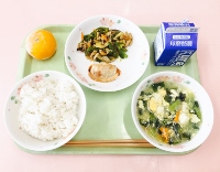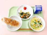 今日の給食には「キャベツの昆布あえ」があります。ごま油の香りがアクセントになっていると思いますので、おいしく食べてほしいと思います。今日の給食も一口30回を目標によく噛んで残さず食べてくださいね。