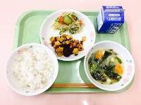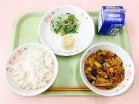 今日の給食には「マーボーなす」があります。なすの紫色は「ナスニン」というものによるもので、目の疲れをとるなどの働きがあります。旬の野菜をしっかり食べて、元気に過ごしましょう。
