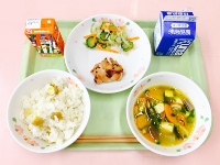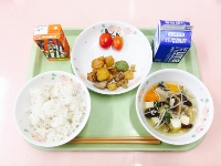 栗ごはん、牛乳、夏のっぺい汁、鶏肉の梨だれ焼き、きゅうりの梅肉和え、ジューシー