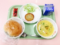 丸パン、牛乳、かぼちゃのポタージュ、ささがきごぼうのハンバーグ、ゆでキャベツ、ケチャップソース