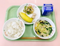 麦ごはん、牛乳、ラーメン風スープ、うずらの卵の醤油煮、キムチ和え、バナナ