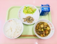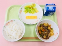 麦ごはん、牛乳、野菜のカレー煮、大豆といりこのかりんとう、キャベツのごま酢和え
