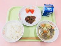 麦ごはん、牛乳、のっぺい汁、魚つみれの甘酢あんかけ、いちご