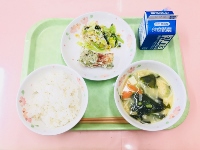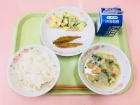 今日の給食には「キムチスープ」があります。ピリ辛の味付けで、体が温まるスープです。今日の給食も一口30回を目標によく噛んで食べましょう。