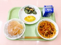 米粉パン、牛乳、スパゲッティミートソース、ほうれん草入りオムレツ、ひじきサラダ
