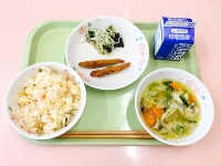 今日の給食には、「キムたくごはん」があります。長野県の給食の人気メニューで、キムチとたくあんが入った混ぜごはんです。他にも、豚肉やパプリカ、にらなど具だくさんです。また、「きびなごのカレーフライ」は天草でとれたきびなごです。今日の給食もよく噛んで残さず食べましょう。