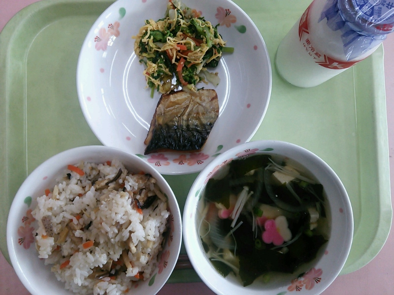 牛乳、まぜごはん、すまし汁、塩サバ、菜の花和え