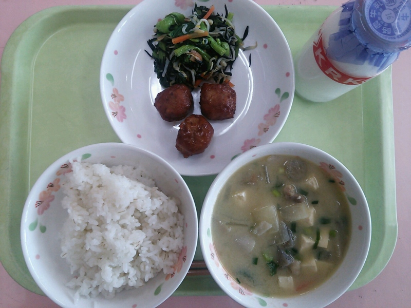 牛乳、麦ご飯、味噌けんちん汁、みつせ鶏の焼きだんご、小松菜とひじきの和え物