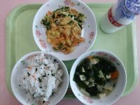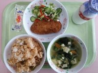 牛乳、鮭ワカメご飯、若竹汁、かきあげ、菜の花和え