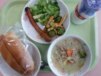 今日は、セルフドッグです。ウインナーとレタスをパンに上手にはさんで食べてください。サラダは、みなさんが好きなフライドポテトとスクランブルエッグが入った「揚げじゃがのサラダ」です。どの学校でも人気のメニューです。パンの日のメニューで、食べやすくなっていますがよく噛んで食べるようにしてください。