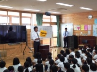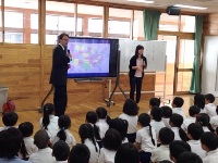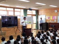 今日は、朝の活動の時間に、ワールド集会がありました。今年度、新たに多良木町に来られたALTのTimothy Hoth(ティモシー・ホス)先生においでいただき、先生の自己紹介と、出身地であるアメリカについて話をしていただきました。ティモシー先生はニューヨーク州の出身で、ニューヨーク州には、テレビなどでよく見る都会ばかりでなく、農場などの自然も多いことを教えてくださいました。はじめて知ることも多く、興味津々で話を聞いていた子ども達でした。