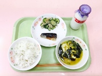 牛乳、麦ご飯、夏野菜の味噌汁、いわしのしょうが煮、ピリ辛きゅうり