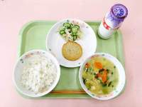 今日は、大根、にんじん、じゃがいも、れんこん、玉ねぎなどの根菜をたっぷり使った「根菜スープ」があります。食べる部分が土の中で育つ野菜のことを根菜といいます。根菜類は、水分が少なくビタミンやミネラルを多く含むものが多いため、体を温める働きがあると言われています。寒い冬にぴったりの食材です。今日の給食もよく噛んで残さず食べましょう。