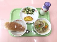 今日の給食は「ビビンバ」です。ビビンバは韓国風の混ぜご飯のことです。肉炒めとナムルをごはんにのせて食べましょう。今日の給食もよく噛んで残さず食べてくださいね。
