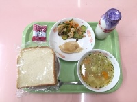 牛乳、食パン、ポテトスープ、鶏肉のサラたまソースかけ、かみかみサラダ、マーシャルビーンズ
