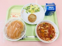 今日の給食には「セルフバーガー」があります。パンにハンバーグとチーズとサラダをはさんで食べましょう。「あっさりミネストローネ」は肉を使わず野菜をたっぷり使って作りました。隠し味にセロリを炒めて使っています。風味よく仕上がっていると思いますので、ぜひ味わって食べてください。