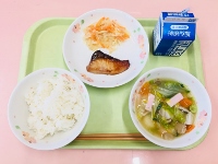 麦ごはん、牛乳、みそつみれ汁、ミックスかりんとう、キャベツのおかか和え