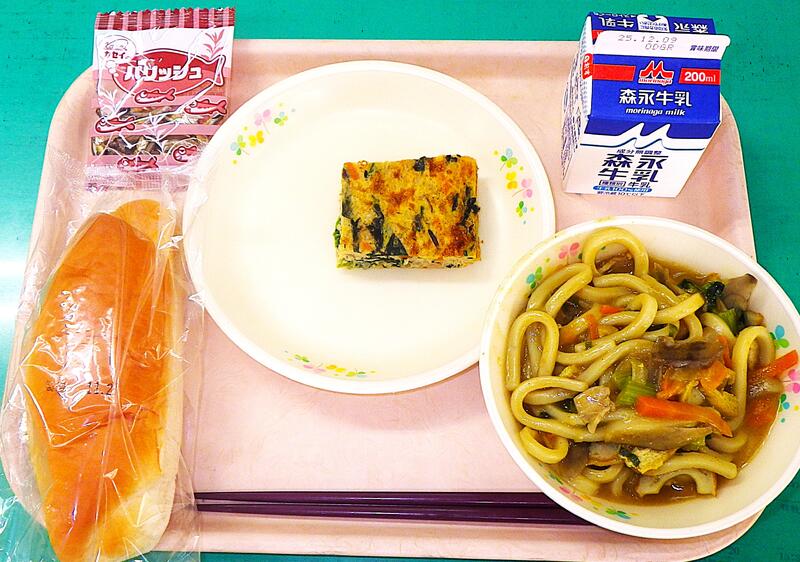 【11/28本日の献立】カレーうどん・手づくりちぐさやき・いりこ・みるくパン・牛乳