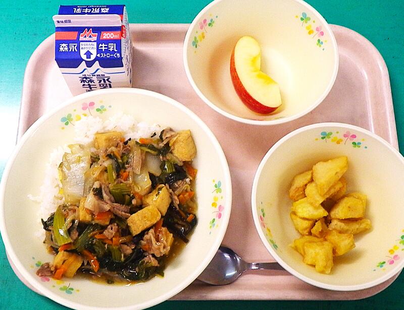 【12/1本日の献立】あつあげのちゅうかどん・みそだれポテト・りんご・牛乳