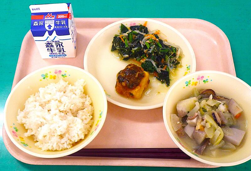 【12/2本日の献立】ぶたじる・あげだしどうふ・ごまツナあえ・むぎごはん・牛乳