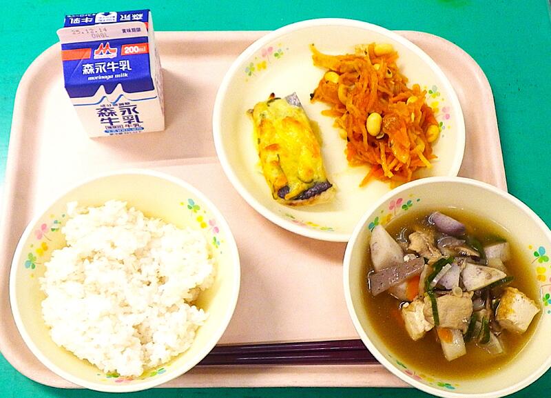 ◎今日は急に寒くなりましたが、具だくさんのおいしいつぼんじるであたたまりました。「つぼん汁」は、鶏肉や里芋などを煮て醤油味で仕上げた熊本の具だくさんの郷土料理です。魚のいろどりやきはマヨネーズ風味でとても美味しかったです!ケチャップでいためた切干大根も美味しかったです!