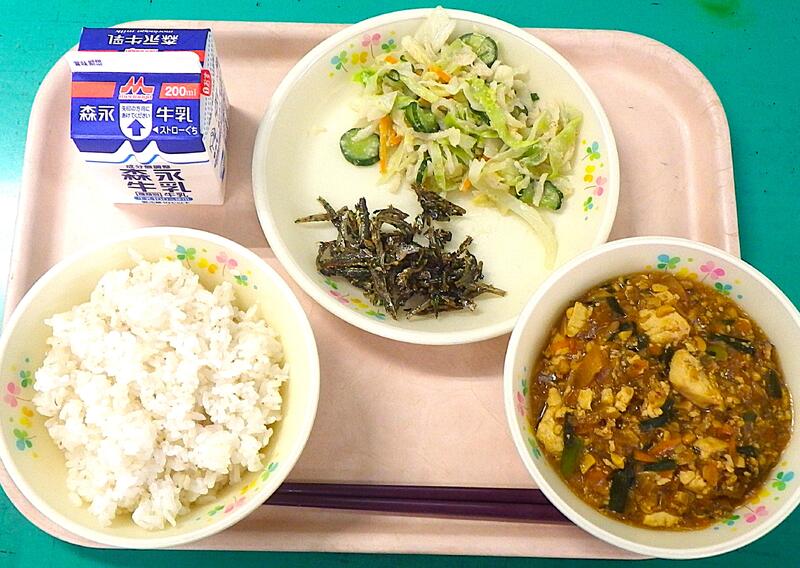 【12/4本日の献立】カレーどうふ・ごまずあえ・あおのりいりこ・むぎごはん・牛乳