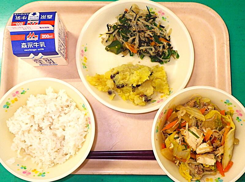 【1/14本日の献立】さといものカレーに・ごまネーズあえ・麦ご飯・みそしる・牛乳