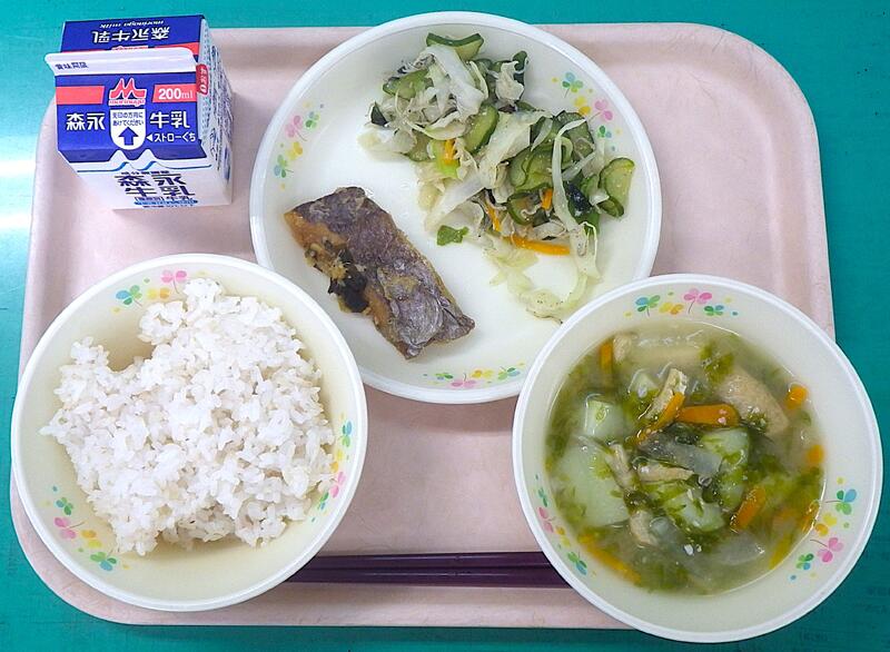 【6/17 本日の献立】魚のピリッとジャン・ごまじゃこあえ・あおさのみそ汁・麦ご飯・牛乳