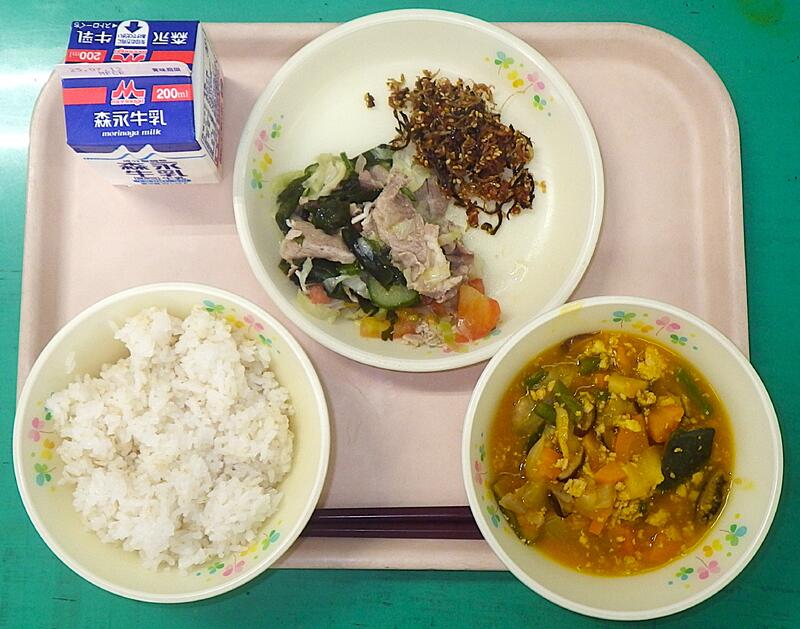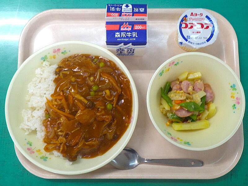 【7/16 本日の献立】夏野菜カレー・コロコロ豆サラダ・アセロラゼリー・麦ご飯・牛乳